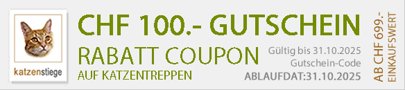 CHF 100.- Rabatt auf allen Katzentreppen bei Katzenstiege Niggli ab einem Einkaufswert von CHF 699.- Einfach diesen Gutschein direkt online im Warenkorb einlösen. Gültig bis 31.10.2025 |
